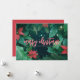 Flat business holiday greeting cards feature "Merry Christmas" on the front of a design of red poinsettias and greenery. Your personalized thank you message, names and logo are printed on the back.