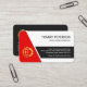 A white cover is accentuated by a red and dark grey trapezium design. Over at the top lies your prestigious name and job title. Near the base inside the dark grey trapezium is your contact details and a slogan caption option. A gold global logo you can use is towards the left inside the red piece.