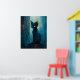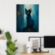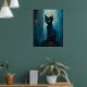 A stylized digital painting of a black cat with piercing yellow eyes, seated against a moody abstract background of teal, blue, and orange. The expressive brushstrokes and shadowy tones evoke mystery and elegance. This piece blends realism with atmosphere, perfect for lovers of feline art and dark aesthetics.