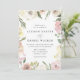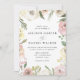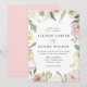 Elegante blumengeschmückte Einladungen mit Ihren Hochzeitsdetails, gerahmt durch eine Grenze von Aquarellfarben-Rose und Blätter in gedämpften Farbtönen wie Rosa, Elfenbein, Lila und Grün. Auf der Rückseite ist ein solider, hellrosa Hintergrund zu sehen. Entworfen, um mit unserer subtile Blooms Hochzeitskollektion zu koordinieren.