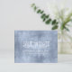 Einzigartige Schriftart, farbenfrohe Aquarellbilder und glitzernde Hintergründe in sanft staubblauer Farbe sind die Highlights dieser Mix-and-Match-Hochzeitsprodukte. Diese Hochzeitspostkarte "Save the Date" bietet eine Vorlage, um Ihre eigenen Namen, Hochzeitstermin und Nachricht in einem einfachen Format für die Rücksendung von E-Mails hinzuzufügen. Ein glänzendes, texturiertes Muster in hellen und dunklen Tönen staubblauer Farbe fügt einen kontrastreichen Hintergrund auf der Rückseite hinzu. Suchen Sie ID515, um alle passenden Produkte in diesem Set zu sehen.