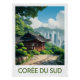 Ein Plakat aus Südkorea zeigt ein traditionelles Hanok-Haus im Herzen des Grünen, mit Blick auf die modernen Wolkenkratzer in Seoul. Eine perfekte Wanddekoration, um die Harmonie zwischen Tradition und Modernität zu symbolisieren.