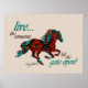 Das ist ein einzigartiges "One of a Kind" Hochwertiges Pferdeposter! Es enthält eine galoppierende Pferd-Silhouette in Türkis, Orange und Schwarz auf einem Tan-Hintergrund und die aufblühenden Worte..."Lebe wie jemand Verlassen The Gate Open"! Dies ist ein Original Grafikdesign von Artist Kerry Miller.