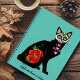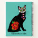 Eine schwarze Katze mit dem Tag des toten Zuckerschädels bildet sich in einer aquamarinen Kulisse auf.