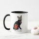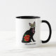 Eine schwarze Katze mit dem Tag des toten Zuckerschädels, die sich in einer aquamarinen Kulisse aufsetzt