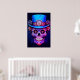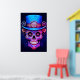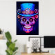 Sugar Skull image in blue and red, with a black background, on a wall poster.