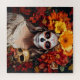 Ein Fest von Leben und Tod ist eine Zuckerschädelin - eine auffallende Verkörperung von Schönheit und Sterblichkeit. Ihr Gesicht ist fasziniert mit lebendigen Día de los Muertos-Mustern. Ihre Augen sind von Blütenblättern umgeben, die an Muränen erinnern. Aus ihren Haaren kaskadieren farbenfrohe Blume und ein Schädel mit hohlen Augenhöhlen.
