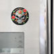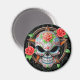 Dieses komplizierte Design des Zuckerschädels steht auf einem Fünf-Punkte-Stern, der von einem großen Kreis gerahmt ist. Der Schädel ist mit Wirbel und Punkten sowie einer großen Rose und Blätter in der Stirn dekoriert. Feine Weinberge schlängeln sich durch den äußeren Kreis, auf beiden Seiten erscheinen zwei Rose. Der Schädel sitzt auf einem reinen schwarzen Hintergrund und verleiht diesem Magneten einen schönen Kontrast. Dieser wunderschöne Tag des Toten Zuckerschädels macht ein aggressives und stilvolles Muster.