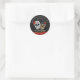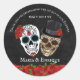 Vintage Sugar Skull Wedding Favor Sticker designed with a romantic sugar skull couple and lush red roses on a bold black background. These round wedding stickers coordinate beautifully with the Vintage Red Sugar Skull Collection and add dramatic flair to your celebration details.