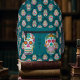Dieser Rucksack enthält Dia De Los Muertos Stil Zucker Schädel Grafik Set vor einem aquamarinen Hintergrund. Die Vordertasche ist bereit, mit Ihren Initialen in aquamariner Schrift personalisiert zu sein.