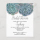 Günstige Brautduscheinladungen mit Sukkulenten-Design. Erschwingliches Flyer Papier hat Vorlagen in handgeschriebenen und gedruckten Schriftart. Die Beispielformulierung ist für ein Brautparty gedacht und für jedes Event leicht zu ändern. Realistische, blau-grüne, sukkulente Blume schmücken die Oberseite des Weißpapiers.