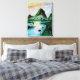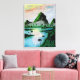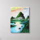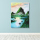 traditionelle Aquarellmalerei von grünen Bergen, dicker grüner Dschungel mit vielen Palmen und ein See unter einem bunten Sonnenuntergang als dekorativer Leinwand gedruckt