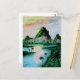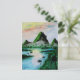 eine traditionelle Aquarellmalerei mit grünen Bergen vor einem See und grünem Dschungel unter einem farbenfrohen Sonnenuntergang auf einer Postkarte