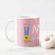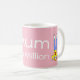 Rosa Tasse mit der Meldung 'Mum in a Million' in weißen Buchstaben. Hat Cartoon einer Mutter, die blaue Jeans trägt, und ein gelbes T-Shirt mit einer roten Blume auf stehenden auf ihrem Kopf. Personalisieren Sie diese Tasse einfach, indem Sie den Vorlagentext bearbeiten. Großartiges Geschenk zum Geburtstag oder Muttertag. Sehen Sie sich meine passende Muttertagskarte in meinem Geschäft an. Danke, dass du mir meine Designs angesehen hast!