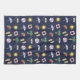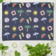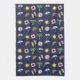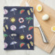 Dunkelblaues Urlaubskuchhandtuch mit farbenfroher illustrierter Strandkollektion.