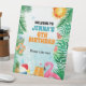 Ein blaues Aquarellhintergrund Set die Bühne für ein lustiges Wasserfarben Sommerstrand Party auf diesem Sockel. Palmen schmücken die Seiten des Aufklebers mit Strandartikeln wie einer Strandkugel, einer Sandburg und einem Flamingo-Float, die auf den Blätter verteilt sind. Das Hotel ist ein gutes Begrüßungs- oder Unterrichtszeichen für Kinder- oder Erwachsene-Strandbesuch im Sommer Geburtstagsparty, Bachelorette oder Bachelor-Party, GRILLEN oder ein lässiges Beachtheater. Verfügbar mit passenden Produkten.