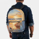 Sonniger Rucksack mit einem Bild eines Sonnenuntergangs am Strand und auf der Tasche ein Bild eines Segelbootes in einer Küstenstadt. Gute Stimmung für den Sommer und das ganze Jahr!