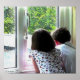 Junge und Mädchen schauen aus einem Fenster auf den Sommerregen