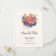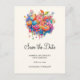 Save the Date Postkarte mit einer farbenfrohen Sammlung von Frühlings- und Sommerkollektionen. Rosa Orange und Blau dominieren das Farbschema. Helle und mutige Blumenarrangements strahlen Glück aus. :