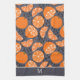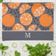 Dieses helle und farbenfrohe Küchenhandtuch weist ein Muster aus orangefarbenen roten Scheiben auf einem komplementären grauen Hintergrund auf. Ihr Monogramm ist unten in weiß auf einem passenden Rahmen.