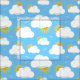 Himmelblau mit einem sommerlichen Muster von weißen flauschigen Wolken und orangefarbenen Sonnen