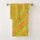 Farbenfrohe Badehandtuch-Set mit gelben, orangefarbenen und limiengrünen Mustern sorgen für ein angenehmes Bad.