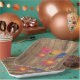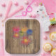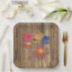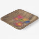 Trendy Teller vom 4. Juli mit farbenfrohen Feuerwerken auf einem Holzboden.
