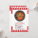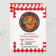 A cool summer fun backyard bbq grill 4th of July party celebration with illustration of a grill bbq, red plaid gingham pattern, with bbq written in carbon burning on the grill