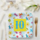 Sommer Party Papier Teller. Ein helles und lustiges Muster von Sommerartikeln mit Sonnenbrillen, Flip Flops, Seestern, Palmen, Muscheln und der Sonne ist der Hintergrund über weite blaue und weiße Streifen. Das Design hat keinen Text und kann für Sommergeburtstage und Grillabende im Hinterhof verwendet werden.