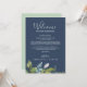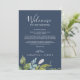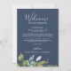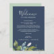 Die Begrüßungskarten und die Visitenkarten der sommerlichen Grün-Marine sind perfekt für eine elegante Hochzeit im Mitsommer. Das botanische Design besticht durch eine üppige Anordnung von gemalten Aquarelleukalyptusfarben, Grünpflanzen und grünen Blätter mit subtilen Blumenzwiebeln in Rosa auf marinebasischem Hintergrund. Auf der Vorderseite der Karte befindet sich ein Begrüßungsschreiben, auf der Rückseite der Karte befindet sich der Hochzeitstag. Diese Noten sind ideal für Hochzeiten in Urlaubsort und Begrüßungstaschen für Hotelgäste.