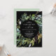 Dieses Sommer Grün Schwarz lässige Hochzeit Einladung ist perfekt für eine elegante Mitte-Sommer-Hochzeit. Das botanische Design besticht durch eine üppige Anordnung von gemalten Aquarelleukalyptusfarben, Grünpflanzen und grünen Blätter mit subtilen, rosa Blüten auf schwarzem Hintergrund.