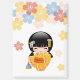 Vector Illustration eines niedlichen orientalischen Mädchen in einem hellgelben Kimono Kleid mit breitem Bi-Sash mit einem blauen Kinchaku Zugsack. Das schwarze Haar des Mädchens ist mit Blume und geisha-artigen Haarnadeln dekoriert. Dieses Kunstwerk wurde von traditionellen japanischen Kokeshi-Puppen inspiriert. Große, farbenfrohe Blume, die wie Sakura-Blüten geformt sind, bilden einen einfachen Hintergrund.