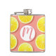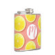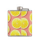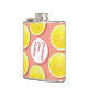 Ein Muster aus frischen und saftigen Zitronenschnitzen in lebhaften, lebhaften Gelbtönen, mit einer Aquarellstruktur, die ihm ein frisch geschnittenes Aussehen verleiht. Sie sind auf einem lachsfarbenen Hintergrund platziert, um einen hellen und sommerlichen Look zu erhalten, wie eine rosa Limonade.