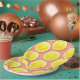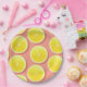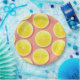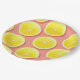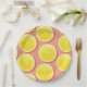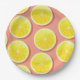 Ein Muster aus frischen und saftigen Zitronenschnitzen in lebhaften, lebhaften Gelbtönen, mit einer Aquarellstruktur, die ihm ein frisch geschnittenes Aussehen verleiht. Sie sind auf einem lachsfarbenen Hintergrund platziert, um einen hellen und sommerlichen Look zu erhalten, wie eine rosa Limonade.