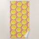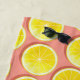 Ein Muster aus frischen und saftigen Zitronenschnitzen in lebhaften, lebhaften Gelbtönen, mit einer Aquarellstruktur, die ihm ein frisch geschnittenes Aussehen verleiht. Sie sind auf einem lachsfarbenen Hintergrund platziert, um einen hellen und sommerlichen Look zu erhalten, wie eine rosa Limonade.