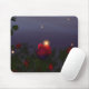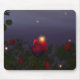 In der Dämmerung einer Sommernacht schweben Glühwürmchen und glühen über einen Rose-Garten voller lebendiger rote Rosen.