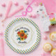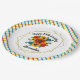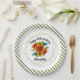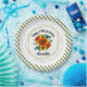 Teller aus dem Sommer-Party mit Blumenmotiv aus Sonnenblumen, goldfarbenem geometrischem Rahmen und farbenfroher rot-gelber und blauer Grenze