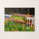 Brillante Blume umgeben eine hübsche Sommerterrasse auf diesem hellen Puzzle.