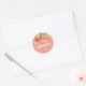 Round sticker. The design features lush watercolor peaches and pink blossoms set against a warm coral background.