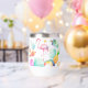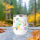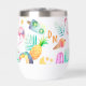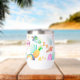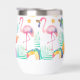 Hier gibt es einen lustigen Thermalwein, Wasser oder Kaffeemaschine, der Sie von den Zuhause-Chören zum Strand oder an einen anderen Ort bringt. Die tropischen Bilder zeigen Zitronen und Grapefruitscheiben, Blätter aus Palmen, Eisbars, ein Tukanvogel und natürlich ein rosa Flamingo. Das Muster wird auf einem weißen Hintergrund platziert, mit zwei Buchstaben auf zwei Seiten.