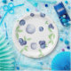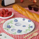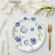 Blaubeeren und gemusterte Papierplatte aus grünem Blatt.