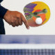 Abstrakte, moderne, gemischte Medienkunst auf einem Tischtennis-Paddel. Kakteen, Sonne und Berge - farbenfrohe, abstrakte Landschaft.