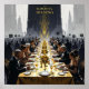 A dramatic digital painting visualizes the theme of societal injustice stemming from extreme wealth. The composition features a towering banquet table, adorned with shimmering gold and silver, where extravagantly dressed figures feast in oblivious luxury. Below this table, in austere grayscale, crowds of underprivileged people look upward, some stretching hands, others fading into shadows.