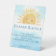 Dieses Baby Shower Diaper Raffle Pedestal Schild verfügt über eine gelbe Aquarellfarbe lächelnd Sonne, stilvolle Typografie und einen blauen Himmelshintergrund. Original Wasserfarbe © Michele Davies.