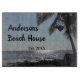 Sonnenlicht, die durch eine Palme an einem tropischen Strand strömt, der in der Ferne von einem sonnigen Ozean umgeben ist. Traumhafte tropische Flecken. Kann mit Familienname und Jahr personalisiert werden