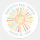 Dieses runde Aufkleber-Design zeichnet sich durch eine lebendige Sonne in der Mitte aus, wobei der fröhliche Satz "Danke!" direkt auf der Sonne platziert wurde. Die Sonnenstrahlen brechen in Gelb-, Orange-, Rot-, aquamarin- und Blautönen aus und bringen Wärme und Freude in Ihre Feier. Oben auf dem Aufkleber wird die "Babydusche der Mama" elegant in aquamarin blau dargestellt, unten ist das Baby-Duschdatum auch aquamarin blau für eine koordinierte und personalisierte Touch. Dieses Design ergänzt perfekt Ihre Sonnendusche und fügt Ihrem Event ein spielerisches und dennoch elegantes Element hinzu. Sie können den Namen, das Datum und die Farben ganz nach Ihren Wünschen anpassen, um Ihre Duschdetails Anzug. Eine perfekte Touch für Dankesgeschenke oder Gastgeschenke!