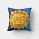Handgemalte Sonne auf Kissen Design. Gelb auf blau Farbe. Volksnaiver Stil.
