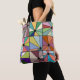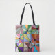 Diese Totentasche hat ein abstraktes Design, das aus neun Quadraten mit einem Kreis und "Strahlen" aus dem Kreis in vielen verschiedenen Farben besteht.
