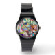 Diese Uhr hat ein abstraktes Design, das aus neun Quadraten besteht, mit einem Kreis und "Strahlen", die aus dem Kreis in vielen verschiedenen Farben kommen.