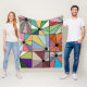 Diese mittelgroße Fleecedecke hat ein abstraktes Design, das aus neun Quadraten besteht, die mit einem Kreis und "Strahlen" aus dem Kreis in vielen verschiedenen Farben kommen.